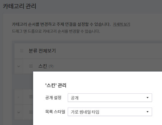 카테고리 관리->해당 메뉴를 선택 후 관리를 눌러주시면 위의 사진처럼 메뉴별로 목록 스타일을 정해줍니다.